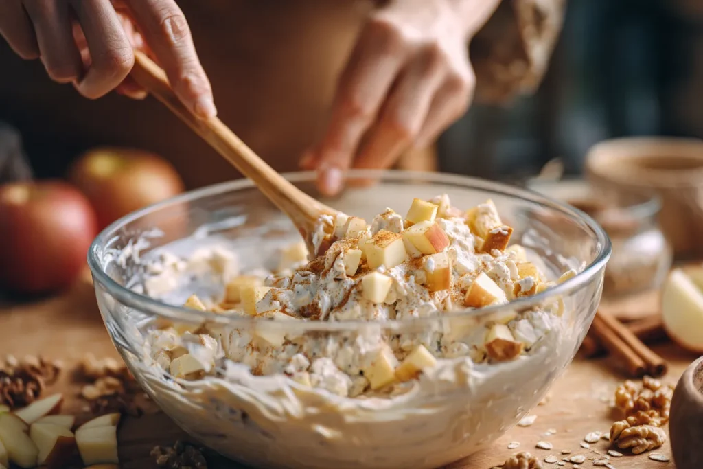 Next, stir in your rolled oats, cinnamon, and salt. Mix until everything is well combined and the oats are evenly coated. Add the diced apples last, folding them gently into the mixture to ensure they’re evenly distributed.