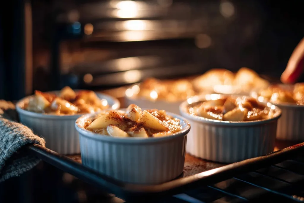 Place the bowls on a baking sheet for easy handling and bake for 25–30 minutes, or until the tops are golden brown and set in the center. You’ll know they’re ready when the edges start to pull away slightly from the sides, and your kitchen smells like a bakery in fall.