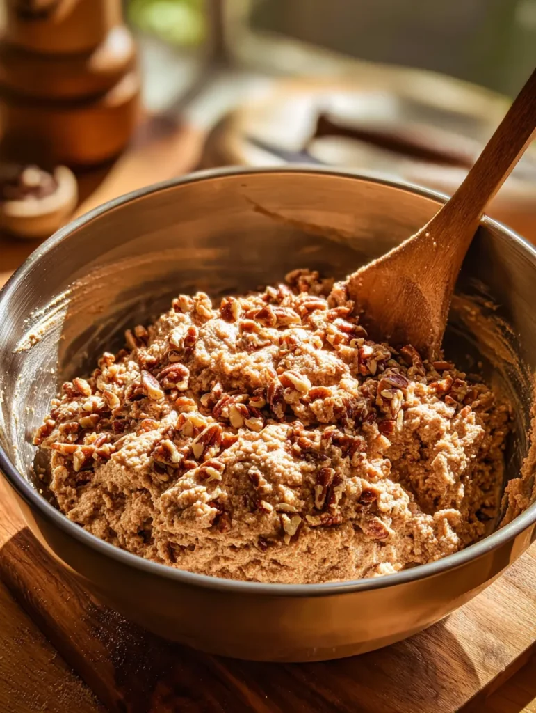 Fold in those beautifully toasted pecans. The batter will be thick, rich, and speckled with tiny golden flecks of cinnamon and nuts.
