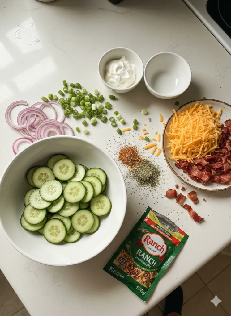 Think about it: cool, crisp cucumber slices coated in a rich, tangy ranch dressing, then loaded up with crispy bacon bits, sharp cheddar cheese, and a sprinkle of fresh green onions. It’s the kind of combination that feels indulgent but still refreshing. You get that satisfying crunch from the cucumbers, a smoky punch from the bacon, and a creamy finish that ties everything together like a good story.