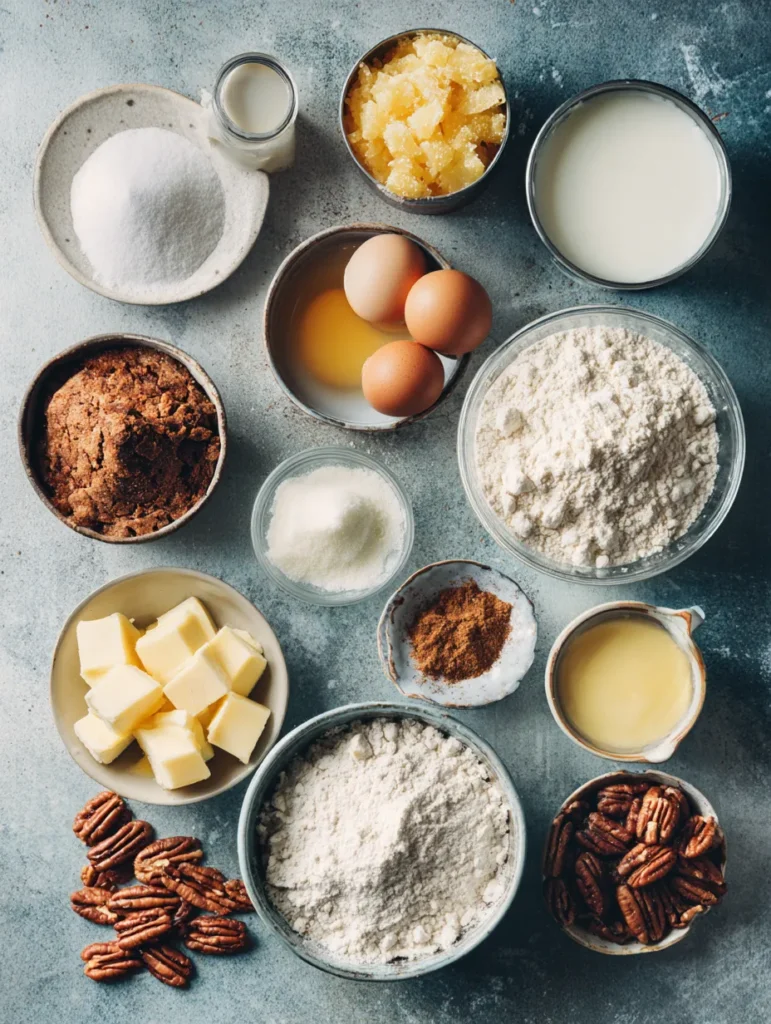 This cake is all about simple ingredients and rich flavor—soft, moist cake bursting with crushed pineapple, brown sugar, and crunchy pecans, topped with a buttery vanilla icing that seeps into every crumb. 🍍✨