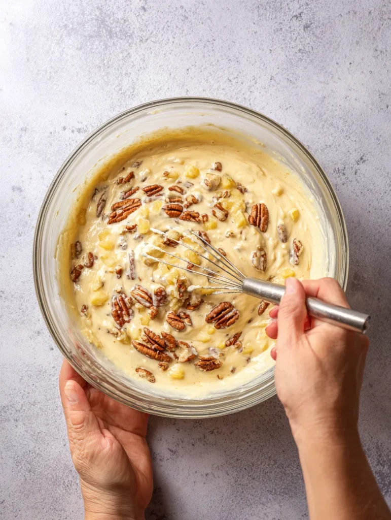 Crack in the eggs and mix until the batter is smooth. Then stir in the entire can of crushed pineapple, including the juice. Don’t drain it—the juice is what makes the cake incredibly moist.