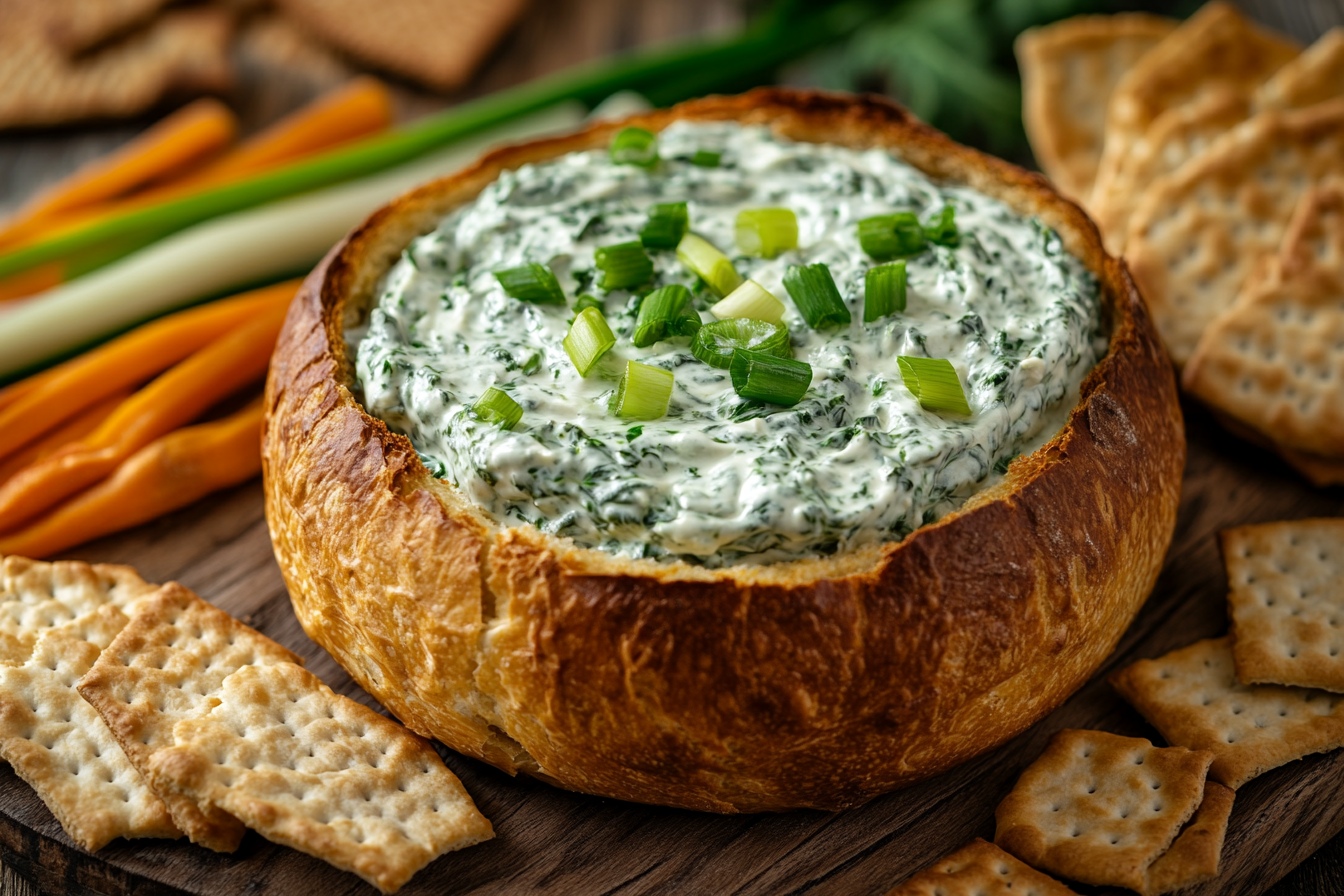 Knorr’s Spinach Dip is a cold, creamy dip made with Knorr Vegetable Recipe Mix, sour cream, mayonnaise, and chopped spinach. It’s known for its smooth, savory taste with a slight crunch from water chestnuts and green onions. This dip is often served in a bread bowl, alongside crackers or fresh vegetables, making it a versatile and delicious appetizer.