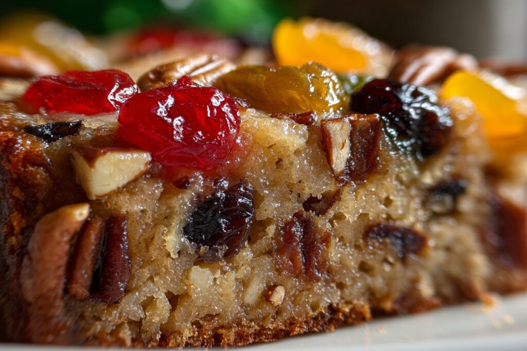 When sliced, the cake reveals a mosaic of jewel-toned fruits—glistening reds, golds, and ambers from the cherries, pineapple, apricots, and raisins. It’s as beautiful to look at as it is to eat.
