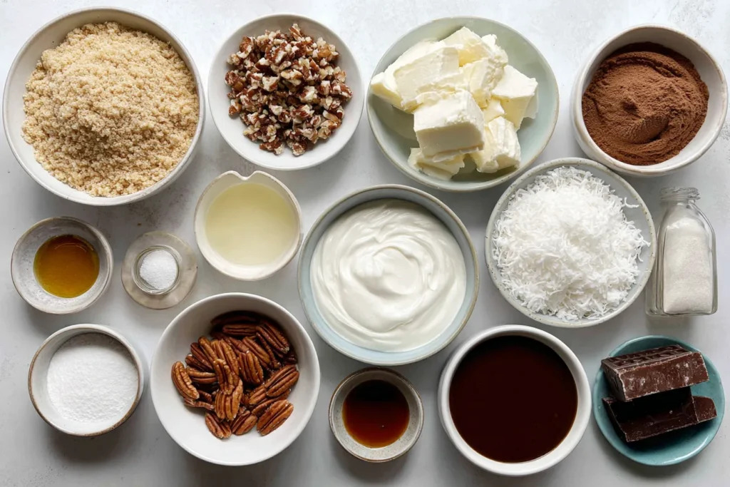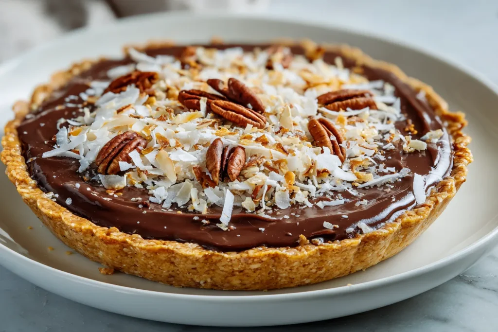 Some desserts are simply irresistible—and this No-Bake German Pecan Chocolate Pie is one of them. With its layers of nutty crust, creamy cheesecake filling, silky chocolate pudding, and a topping of toasted coconut and pecans, this pie is the definition of indulgence.