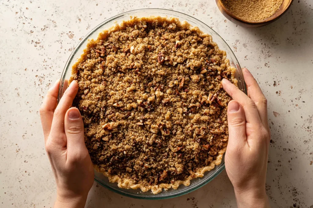 - In a bowl, combine graham cracker crumbs, chopped pecans, and melted butter. Press firmly into a 9-inch pie plate and chill to set.