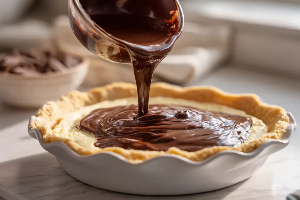 Carefully spread the pudding over the cheesecake layer, making sure it’s smooth and even. This luscious layer is the chocolatey heart of the pie.