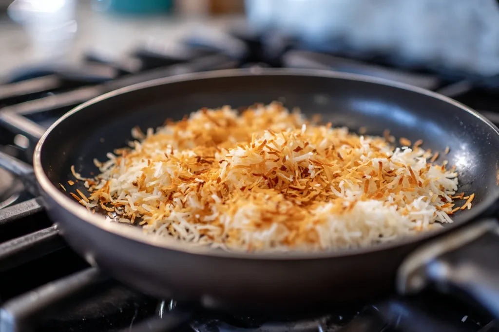 In a dry skillet over medium-low heat, add the shredded coconut. Stir often until it turns golden and fragrant—this usually takes about 3–5 minutes. Be careful, as coconut can go from perfectly toasted to burnt quickly.