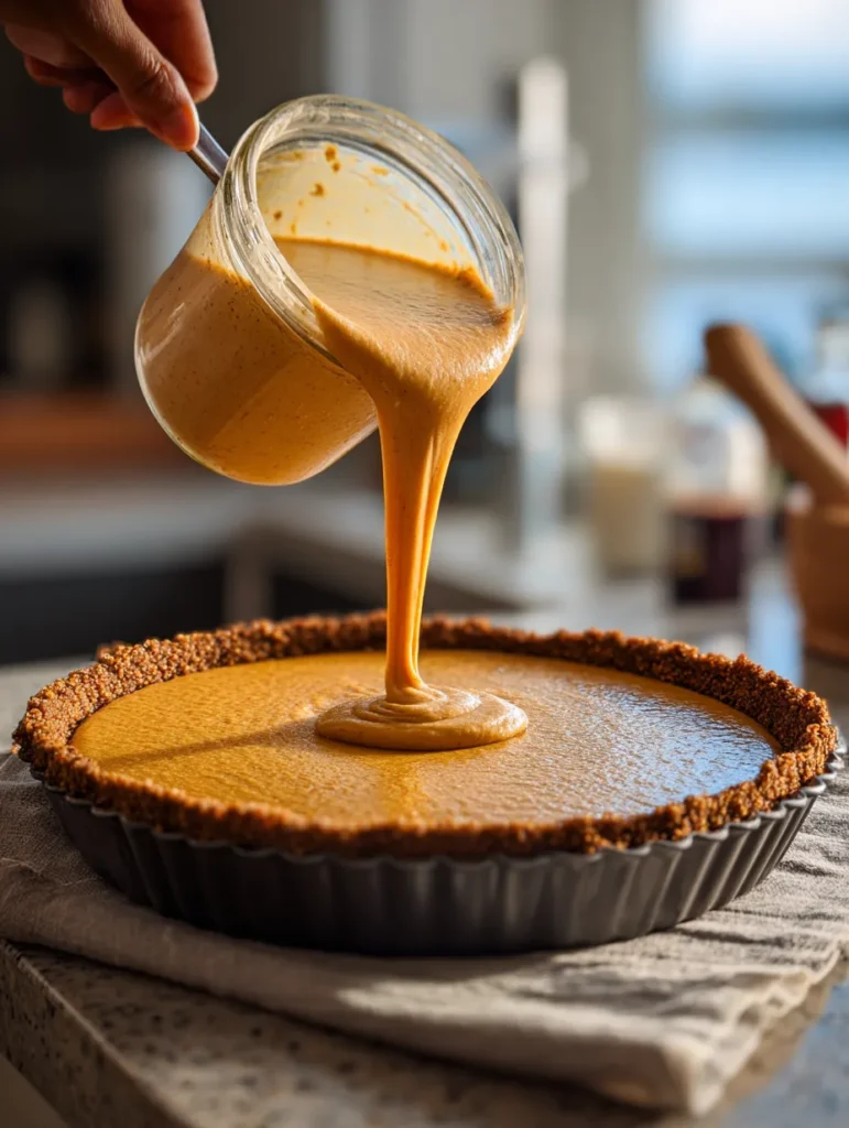 Pour the pumpkin mixture into your pre-made pie crust. Use a spatula to spread it evenly, smoothing out the top. (⏱️ 2 minutes)