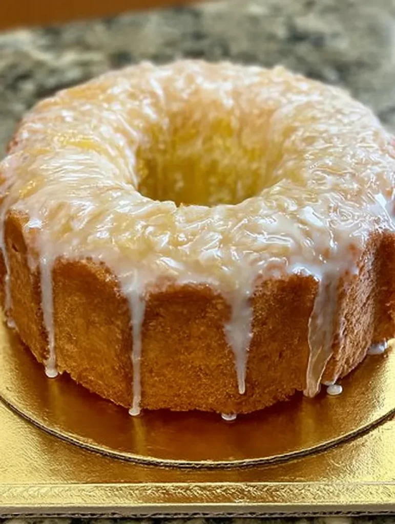 Drizzle the glaze over the cooled cake, letting it cascade naturally down the sides. The glossy finish not only adds sweetness but also enhances the pineapple flavor.