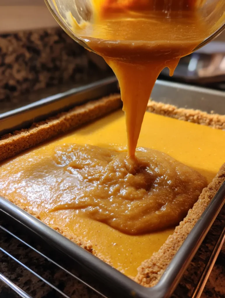 • Pour the pumpkin mixture over the crust, spreading evenly.