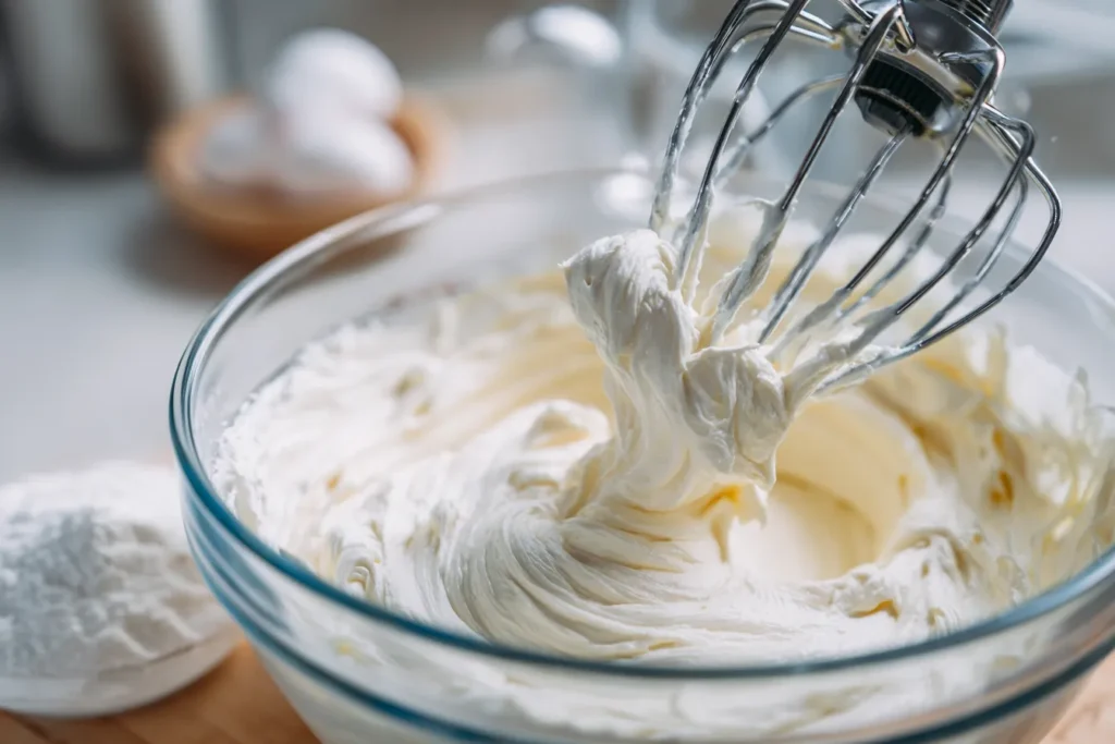 In a medium mixing bowl, beat together 8 oz softened cream cheese and ¼ cup unsalted butter until smooth and fluffy. The texture should be silky, with no lumps. Gradually add 2 cups powdered sugar, mixing on low at first (to avoid sugar clouds!) and then increasing speed once incorporated.