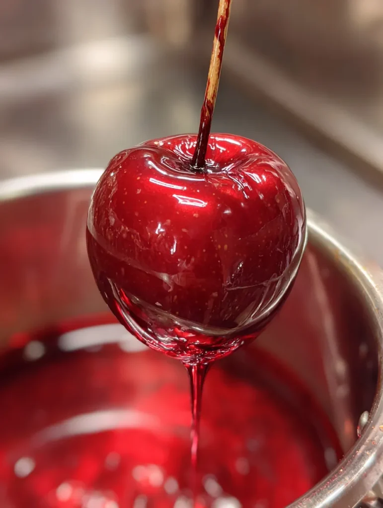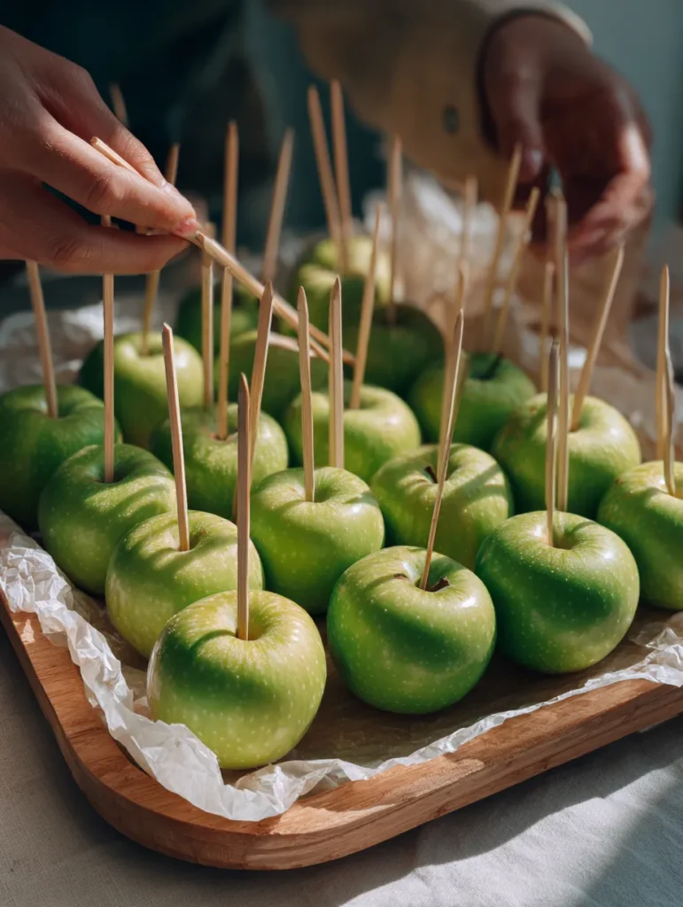 Start by washing your apples thoroughly — you’ll want to remove any wax coating, as it can prevent the candy from sticking properly. Dry them completely, then insert wooden sticks or skewers into the tops.