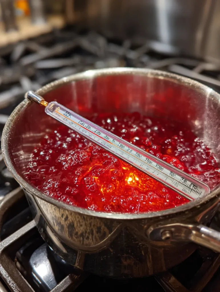 This usually takes about 15 minutes. Once it hits the right temperature, remove it from heat and add a few drops of red food coloring if you’d like that classic shiny red look.